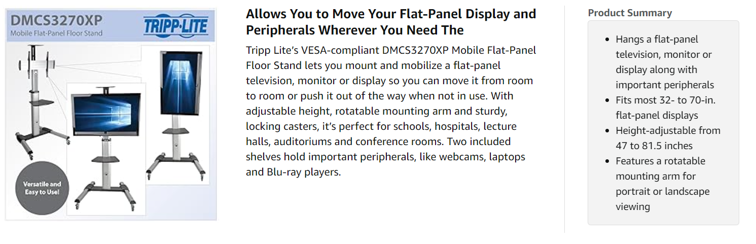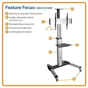 With a durable aluminum and steel frame, the DMCS3270XP fits most 32- to 70-inch flat-panel displays and supports weights up to 110 lbs. For flexibility and convenience, its mounting arm rotates for portrait or landscape viewing. Its locking swivel casters move smoothly through doorways, and its height adjusts from 47 to 81.5 inches.