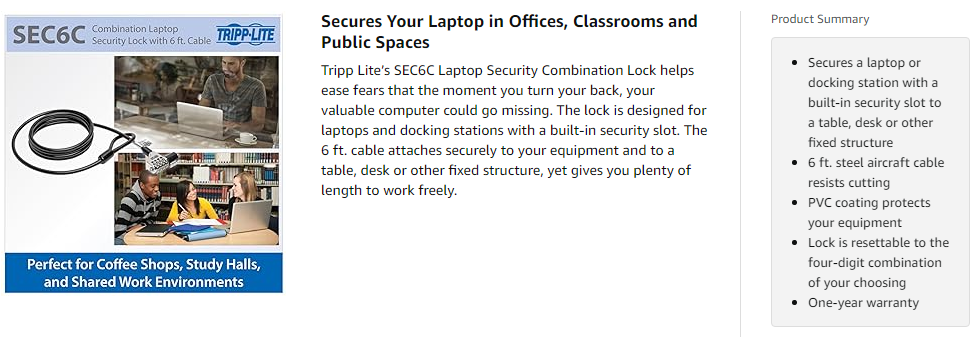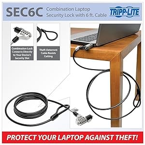 Features an Extra-Strong Lock Head with Resettable CombinationThe SEC6C’s durable, tamper-resistant security lock is resettable to the four-digit combination of your choosing (with 10,000 possible combinations). Simply insert the lock’s pin into the security slot on your device and scramble the numbers. The lock holds securely so you can focus on the job or relax at the coffee shop. |
