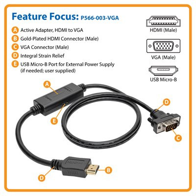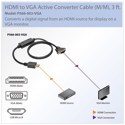 Tripp Lite’s P566-003-VGA converts the digital video signal from an HDMI source such as a computer, Chromebook™, cable box or Blu-ray™ player so it can be displayed on an analog VGA monitor, projector or television. By using this 3 ft. cable with the active adapter built in, you reduce cable clutter at your desktop, while saving the effort and expense of upgrading to a new HDMI display.