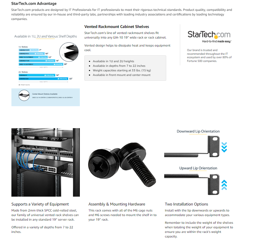 StarTech.com 1U Vented Server Rack Cabinet Shelf - Fixed 10in Deep Cantilever Rackmount Tray for 19" Data/AV/Network Enclosure w/Cage Nuts
