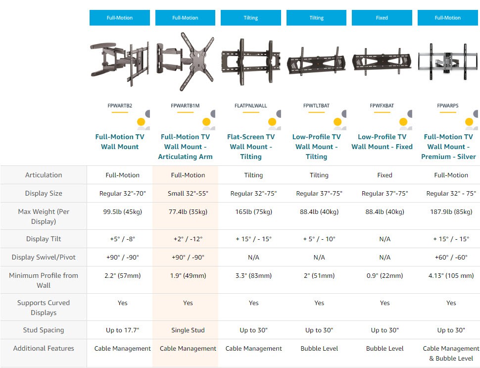 The TV wall mount supports most 32" to 55" (558.8 to 1397 mm) LED or LCD flat panel TVs weighing up to 77 lb. (35 kg).