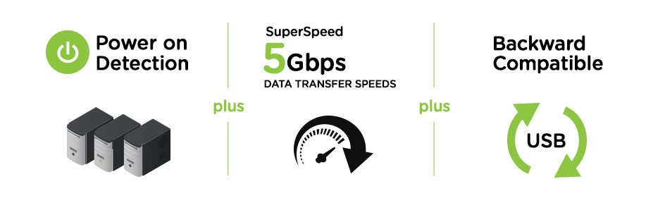 Additional smart connectivity features turn your workstation into a convenient and easy-to-use Plug-N-Play setup. The Power on Detection feature ensures that this KVMP will automatically connect to the next powered on computer. The built in USB3.0 ports allows connectivity of up to SuperSpeed 5Gbps data transfer speeds and provides backwards compatibility with USB 2.0 and USB 1.1 legacy devices.