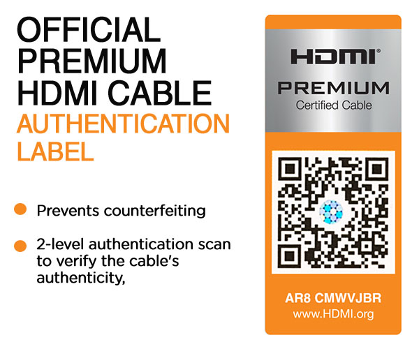 Once the Premium High Speed HDMI Cable has passed the rigorous testing requirements at an HDMI ATC, each cable is adorned with an official Premium HDMI Cable Authentication Label to differentiate it from other HDMI cables. This label also prevents counterfeiting and carries with it both a QR code and a unique holographic fingerprint. You can use the HDMI mobile verification app available for download from various app stores to complete the 2-level authentication scan and verify the cable's authenticity, certification and product information.
