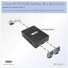 Supports Ultra High Definition Signals up to 15 ft.Using standard 28 AWG HDMI cable, the B118-002-UHD-2 distributes a 4K x 2K audio/video signal up to 15 feet (4 meters). Be sure the HDMI cables connecting the splitter to the source and to the displays are no longer than 15 feet. For best performance, we recommend using Tripp Lite’s P569-Series Premium High-Speed HDMI cables. |