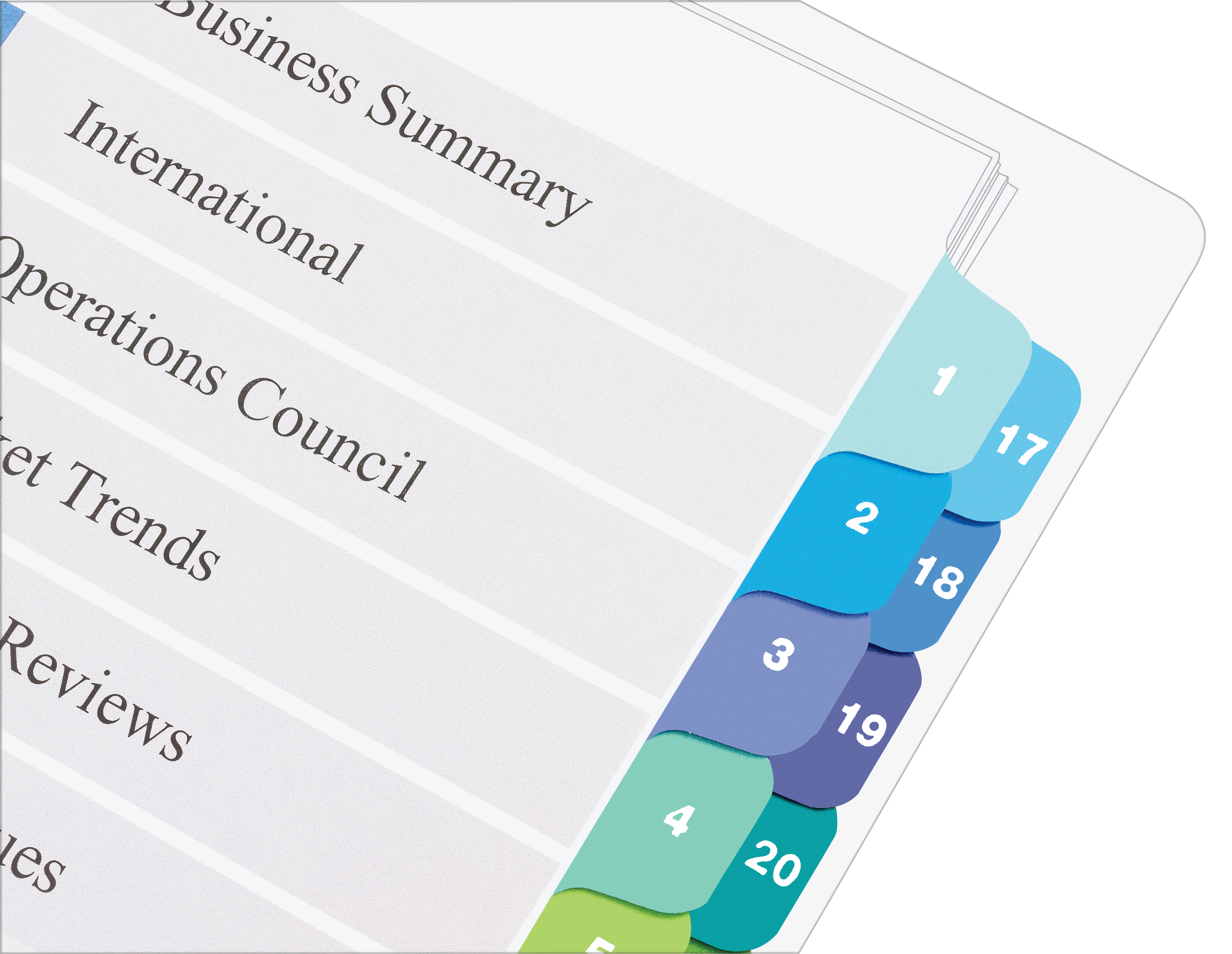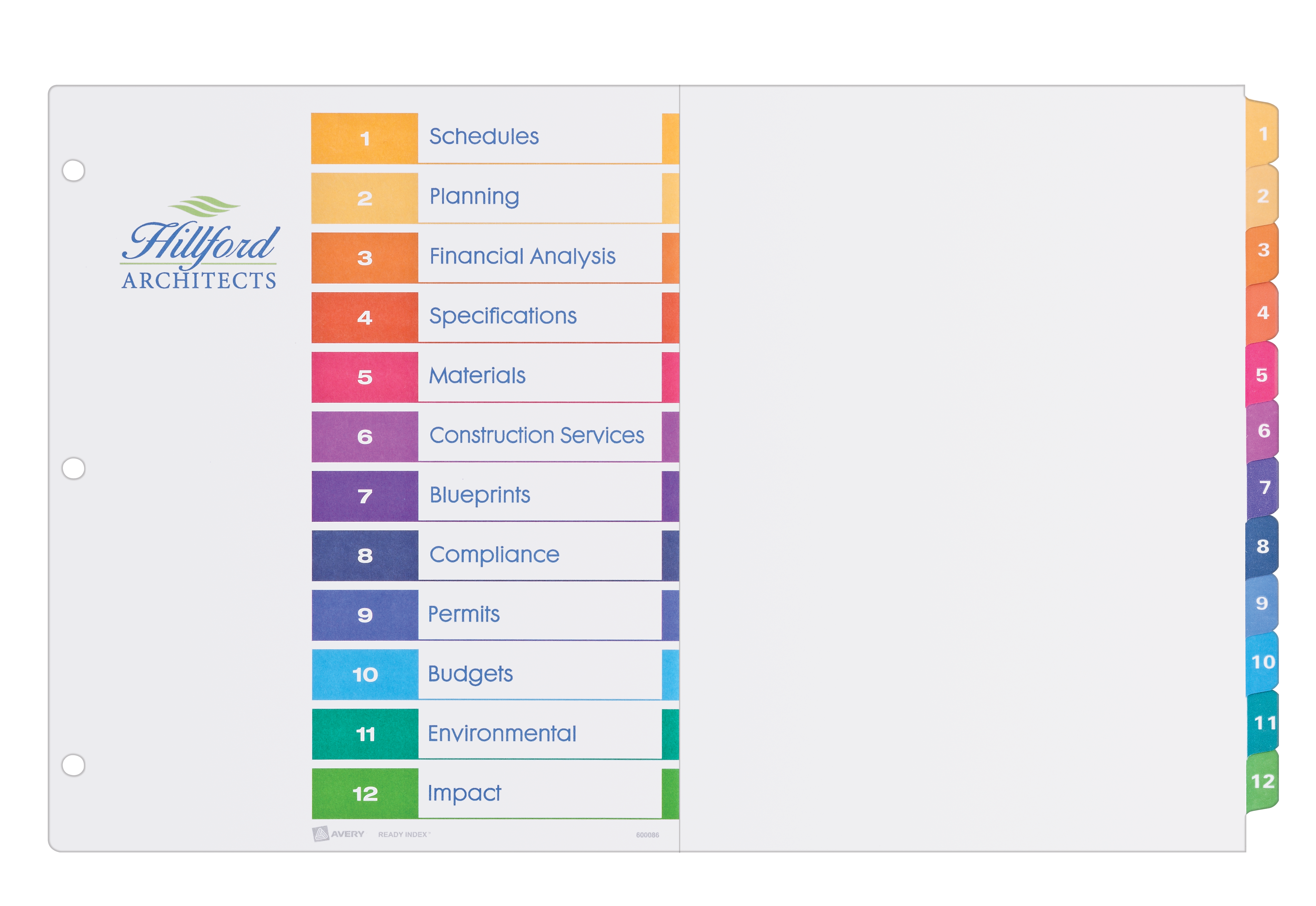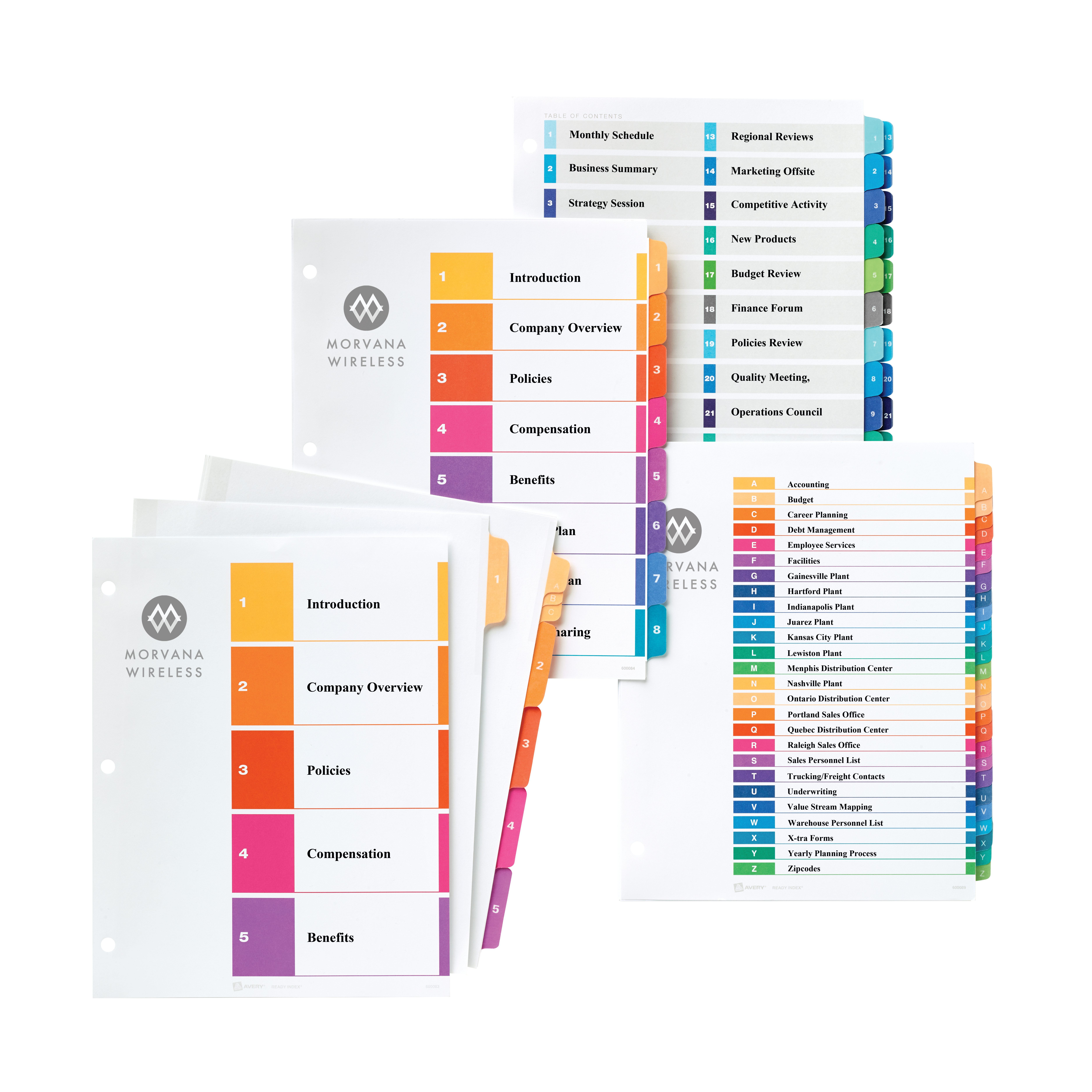 Colors come in traditional or contemporary multicolor, or black & white. Materials include plastic, paper and earth-friendly made from recycled content. Tabs remain visible when used with documents in 9” x 11” sheet protectors. Extended format is perfect for referencing larger documents like spreadsheets, blueprints, and more. Divide main section numerically, then sub-divide smaller sections alphabetically as you organize complex projects. Double column tabs are easy to see and access, making them ideal for larger projects. Easily slide printed titles into the plastic preprinted table of contents sleeve - to update, simply re-print and repeat.
