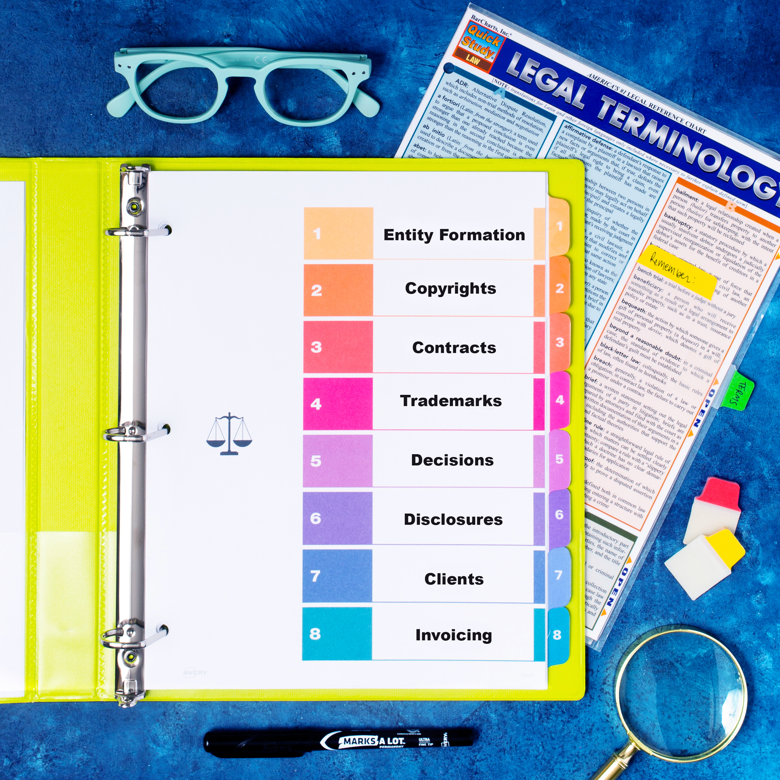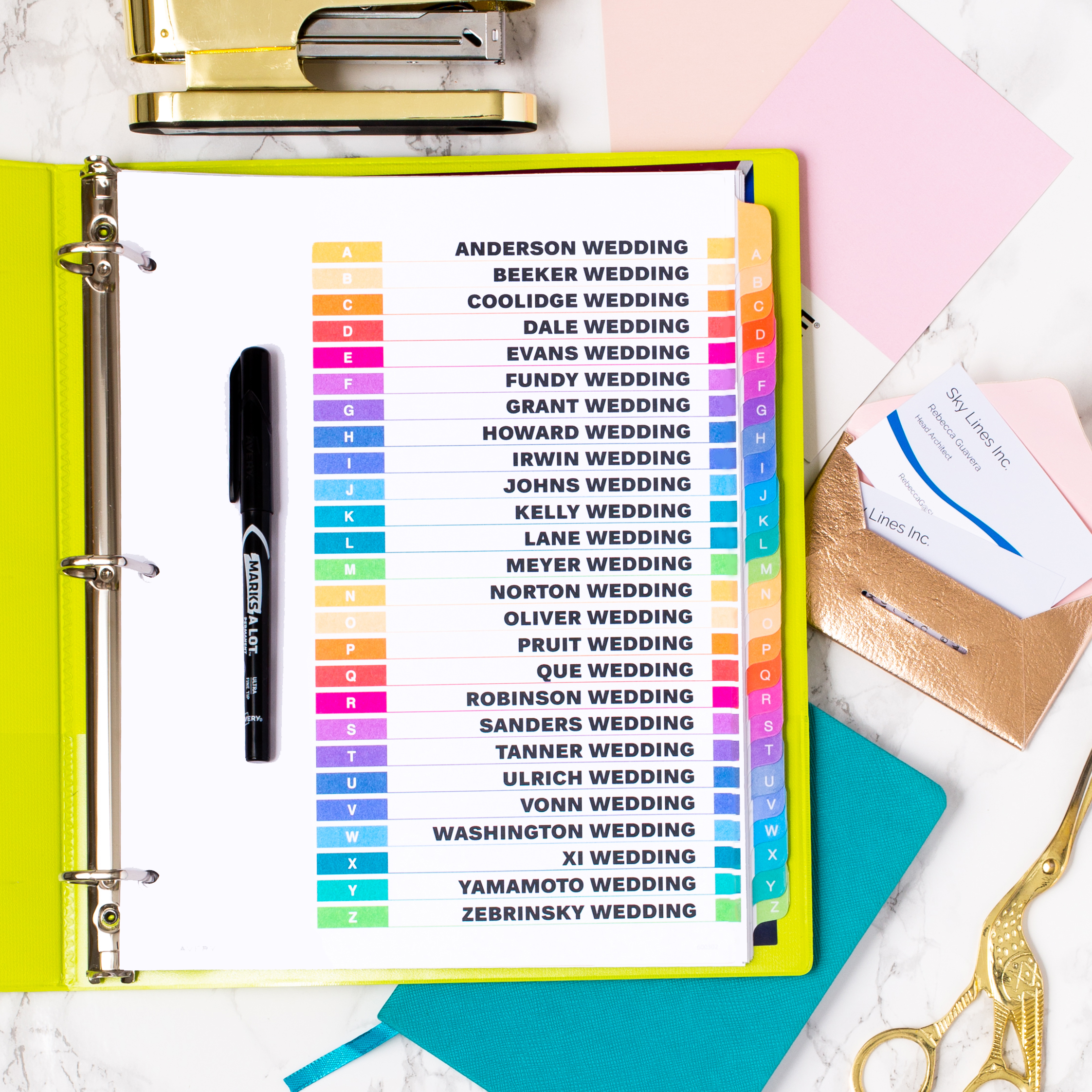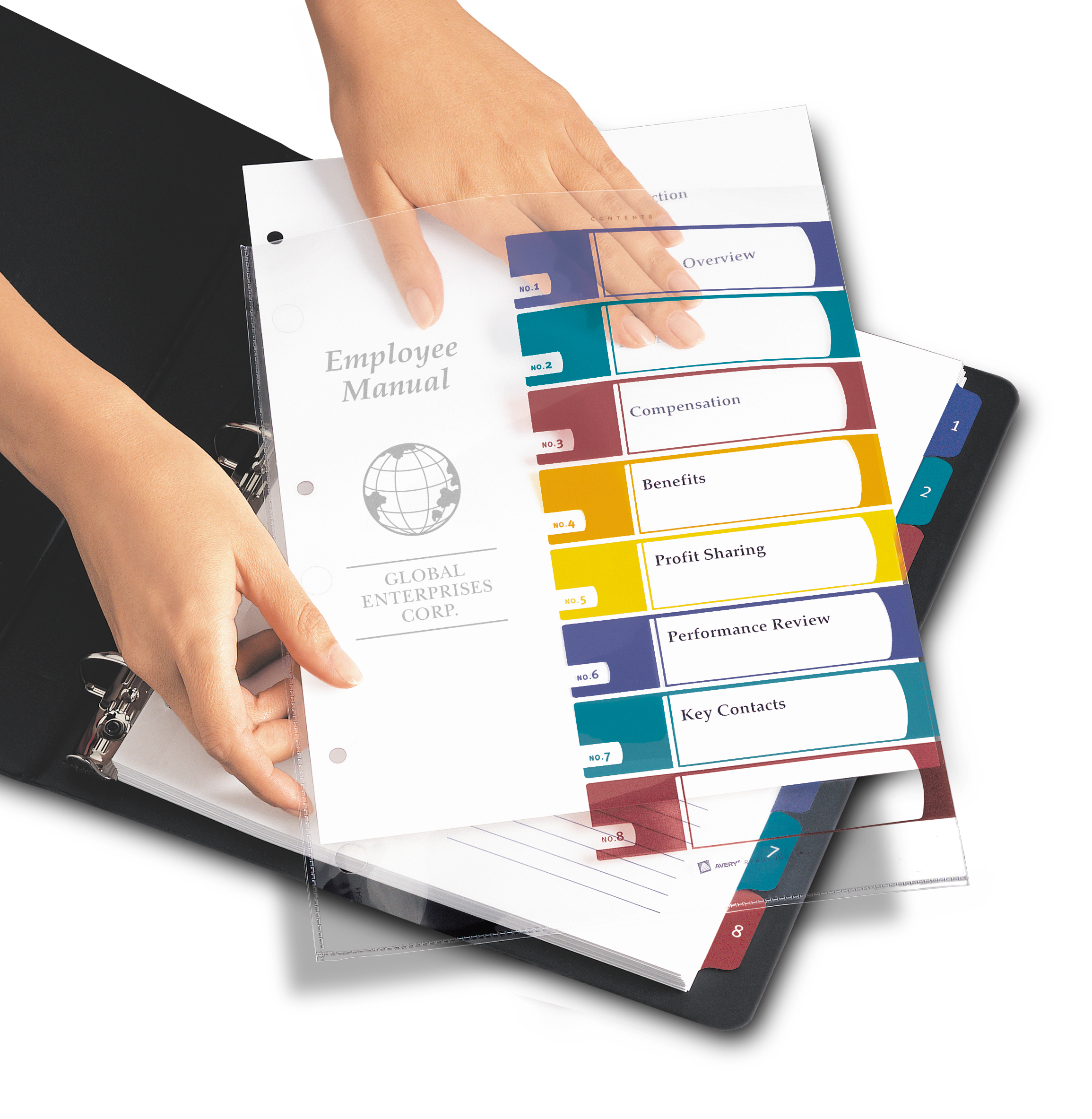 Colors come in traditional or contemporary multicolor, or black & white. Materials include plastic, paper and earth-friendly made from recycled content. Tabs remain visible when used with documents in 9” x 11” sheet protectors. Extended format is perfect for referencing larger documents like spreadsheets, blueprints, and more. Divide main section numerically, then sub-divide smaller sections alphabetically as you organize complex projects. Double column tabs are easy to see and access, making them ideal for larger projects. Easily slide printed titles into the plastic preprinted table of contents sleeve - to update, simply re-print and repeat.