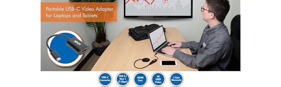 Newer tablets, laptops, Chromebook and MacBook notebooks and even desktop computers often have one or more USB-C (USB Type-C) ports, but come equipped with few others. Tripp Lite’s USB-C to 4K HDMI External Video Adapter makes it possible to connect a video source that supports USB DisplayPort Alternate Mode (Alt Mode) to your existing HDMI television, monitor or projector. From a single USB-C (or Thunderbolt 3) port, you can: