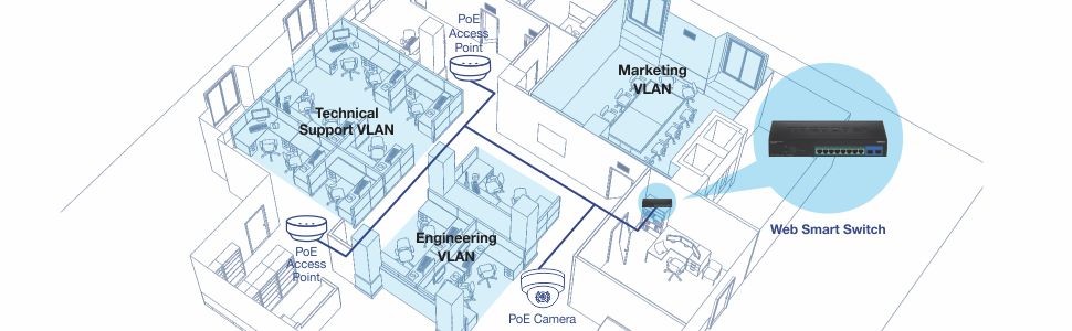 A broad range of network configurations are supported by: 802.3ad link aggregation, Asymmetric VLAN, 802.1Q VLAN, Voice VLAN, RSTP, MSTP, Loopback Detection, GVRP, 802.1p Class of Service (CoS), port bandwidth management, and QoS queue scheduling.