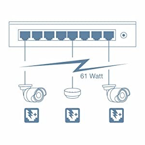 Supplies up to 30W of PoE+ power per port with a total power budget of 61W. Supports both PoE (802.3af) and PoE+ (802.3at) devices.