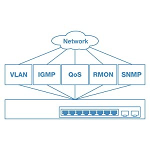 Managed features include access control lists, VLANs, IGMP snooping, QoS, RMON, SNMP trap, and syslog for flexible network monitoring and integration.