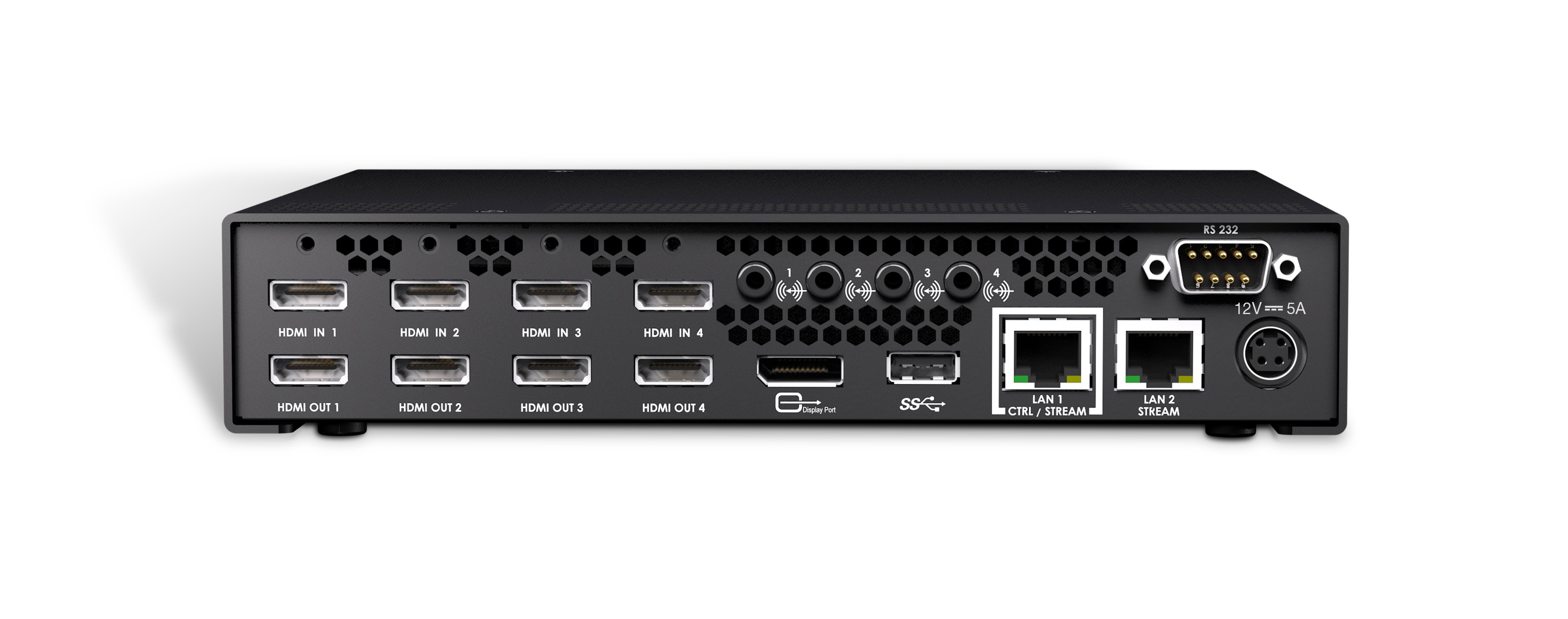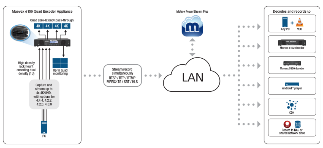 The Maevex 6150 quad 4K encoder is the first in the world to drive simultaneous quad 4K/UHD and Full HD capture, encode, stream, and record from a single standalone appliance. Integrating seamlessly with standard 1 Gigabit Ethernet networks, Maevex 6150 includes zero-latency pass-through for real-time output of audio/video content on up to four 4K displays.
