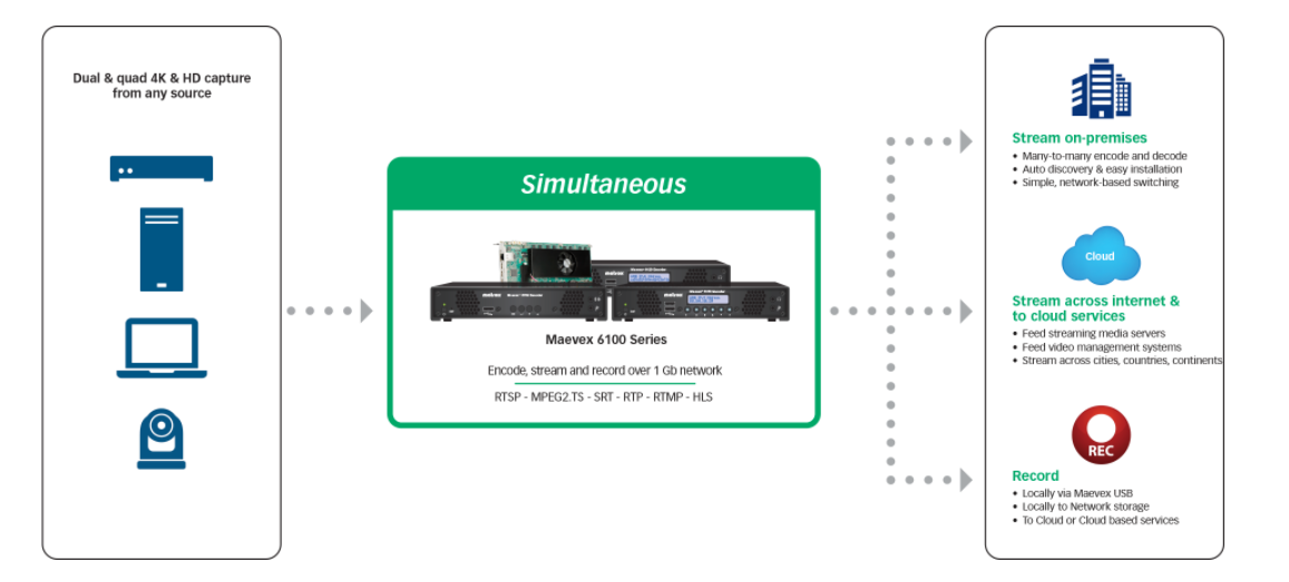 The Maevex 6150 quad 4K appliance allows for simultaneous streaming, processing, and recording on all channels in multiple settings—all without sacrificing quality. This powerful appliance delivers content to on-premises end points, to the cloud and internet series, and also records to local or network storage for later editing and viewing, concurrently. Maevex 6150 can also transmit live and/or recorded content for multiple video-on-demand platforms— such as Facebook Live, YouTube, Twitch, Wowza®, Ustream™, LiveScale, and Restream to name a few.