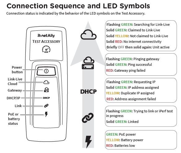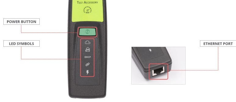 Operating with either Power over Ethernet (PoE) or AA batteries, the Test Accessory attempts to connect to your Ethernet network using DHCP, lighting up each LED with the corresponding connection step. After it's done firing up, you are ready to start performance testing!