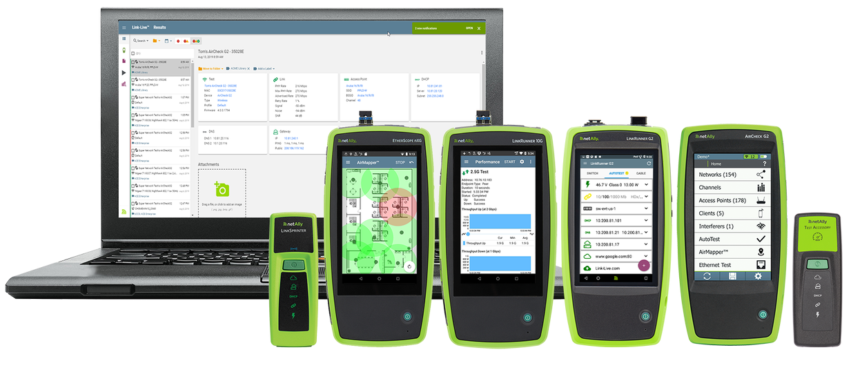 Unified results, reporting, analysis, network mapping, and data management enables collaboration across your entire team. Serving as a centralized test results, analysis, and tester management system, the free Link-Live Cloud Service transforms team workflows with the ability to quickly and easily log, document, and report test activity from all NetAlly hand-held network testers and analyzers.
