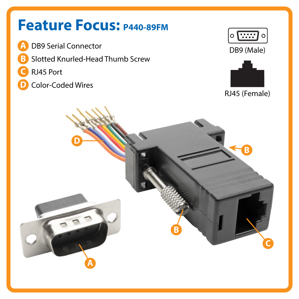 Use Tripp Lite’s DB9 to RJ45 Modular Serial Adapter to connect a serial device, such a terminal, serial printer, modem or POS system, to a network over twisted-pair Cat5e/6 cable. The P440-89FM has a male DB9 connector on one end and a female RJ45 connector on the other. By making DB9 and RJ45 connections compatible, this adapter eliminates the need to upgrade existing hardware.