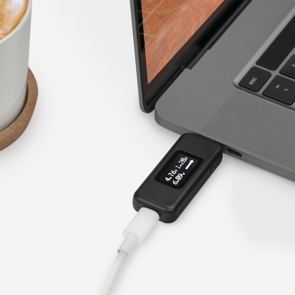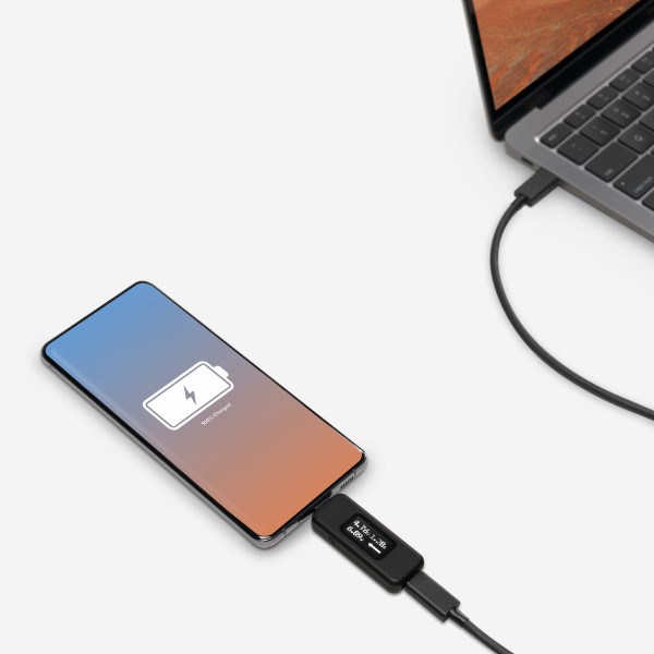 Connect the VAMETER inline between a USB-C host system like a laptop, tablet, or cell phone and a charger to use it as a USB voltage meter or power consumption meter. An updated OLED screen means a brighter and easier-to-read display in any lighting conditions, and a new orientation button lets you flip the screen with a click.