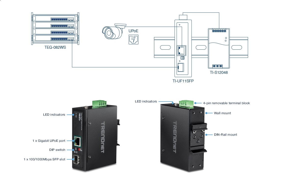 Converts fiber to copper while providing power to PoE, PoE+ and UPoE compliant devices such as IP cameras, VoIP phones, and wireless access points.