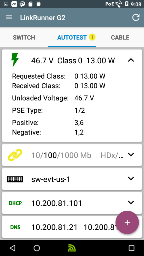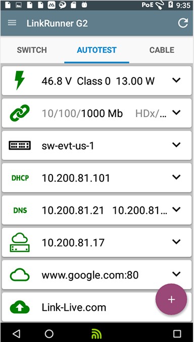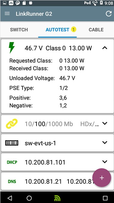 AutoTest performs a default set of key network connectivity tests in seconds, providing a standardized test process that enables technicians to quickly and accurately identify if the problem is in the connected device, the network, or lack of proper PoE being supplied to the RJ-45 jack.