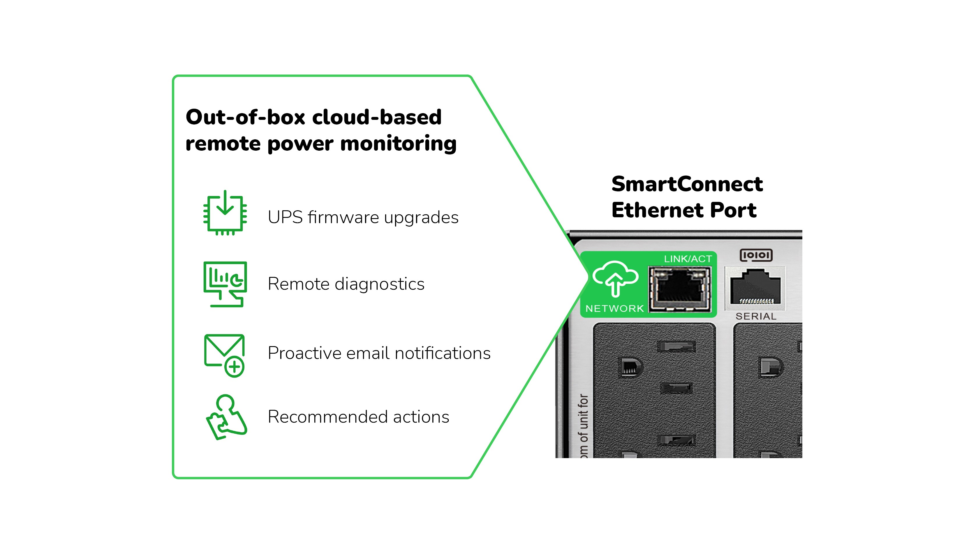 Smart-UPS models with SmartConnect are cloud-enabled and have a built-in Ethernet port, making it easy and cost effective to monitor your UPS online.
