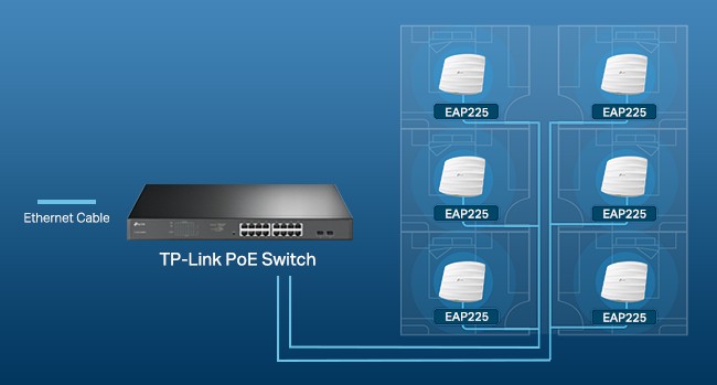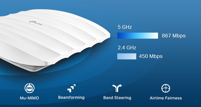 EAP225 provides boosted WiFi speeds up to 1350 Mbps with Beamforming and ensures long-range coverage while advanced wireless technologies like Load Balancing, Band Steering, and Airtime Fairness optimize the whole network to improve performance and efficiency.