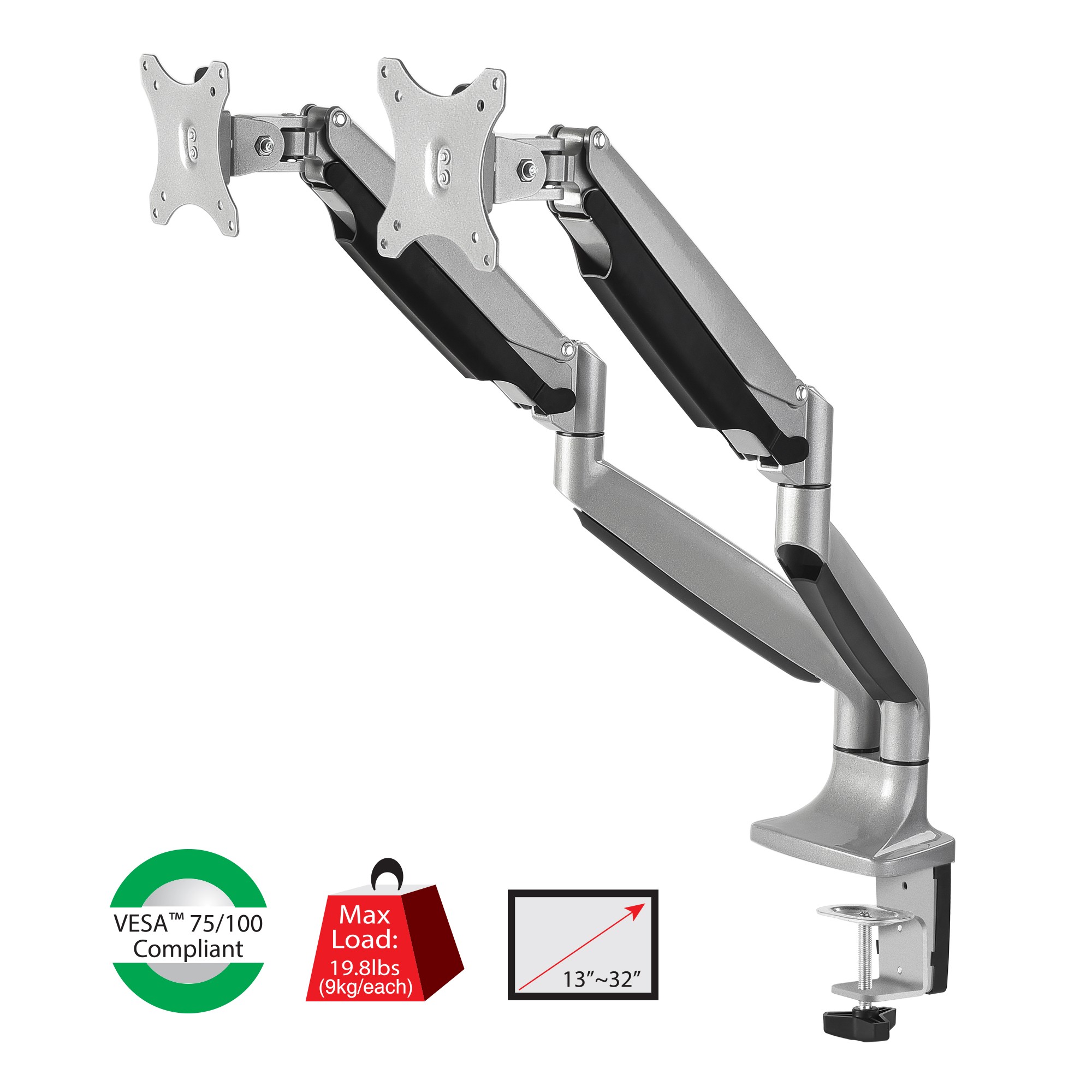 Easily adjust the height and angle of your monitors for a more ergonomic workspace, Fits 13" to 32" monitors, Max load 19.8Ibs(each), VESA 75x75/100x100mm, Detachable VESA plate, C-clamp and Grommet, Cable Management