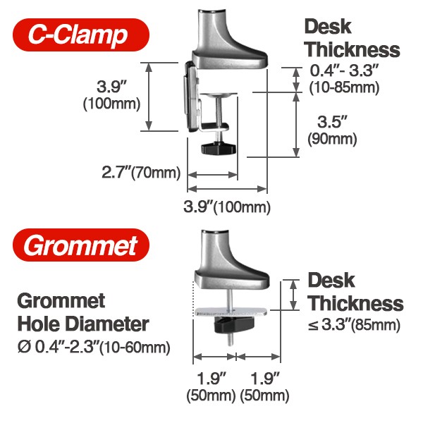 There are two options to mount this desk arm on the table, C-clamp and Grommet bases are both included in the package for easy and quick installation. Please refer to the image above for hole diameter and desk thickness.