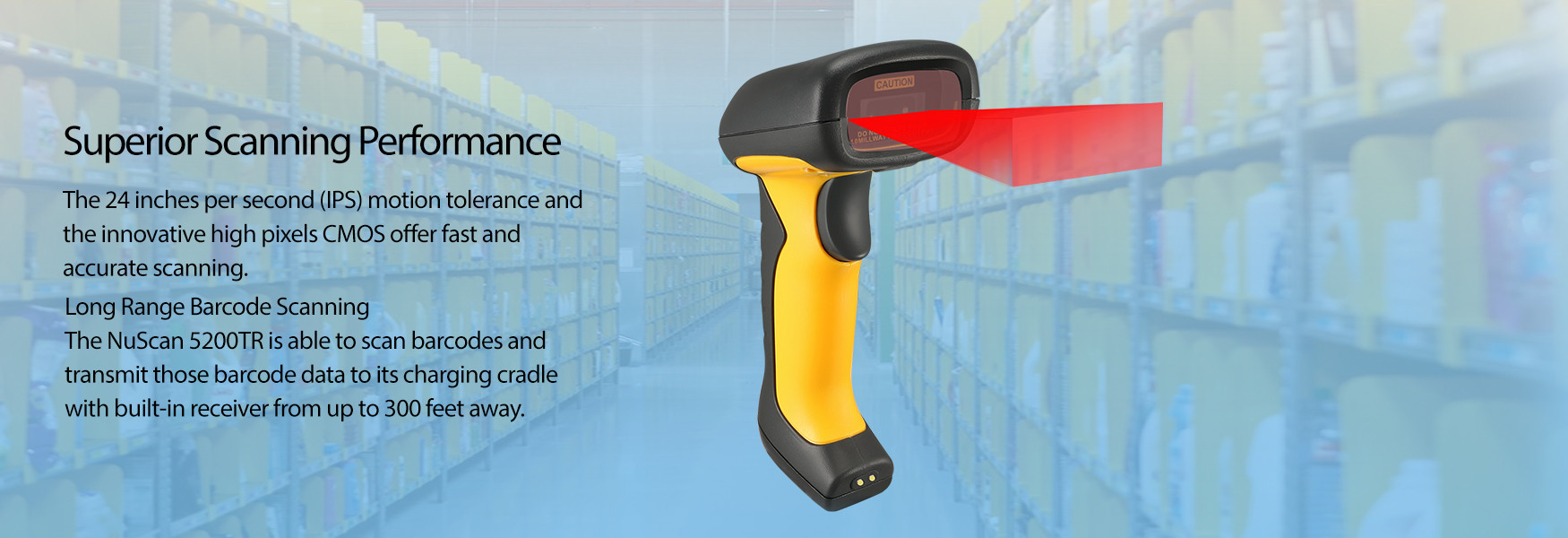 The NuScan 5200TR is able to scan barcodes and transmit those barcode data to its charging cradle with built-in receiver from up to 300 feet away.