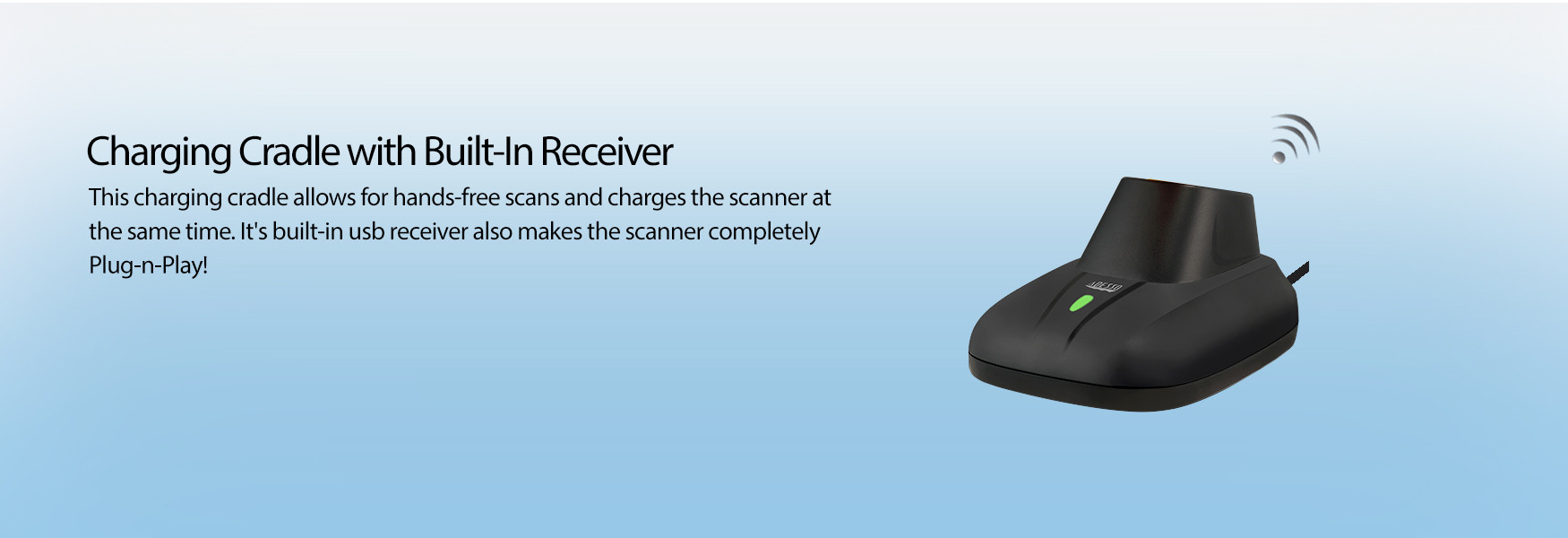 This charging cradle allows for hands-free scans and charges the scanner at the same time. It’s built-in usb receiver also makes the scanner completely Plug-n-Play!