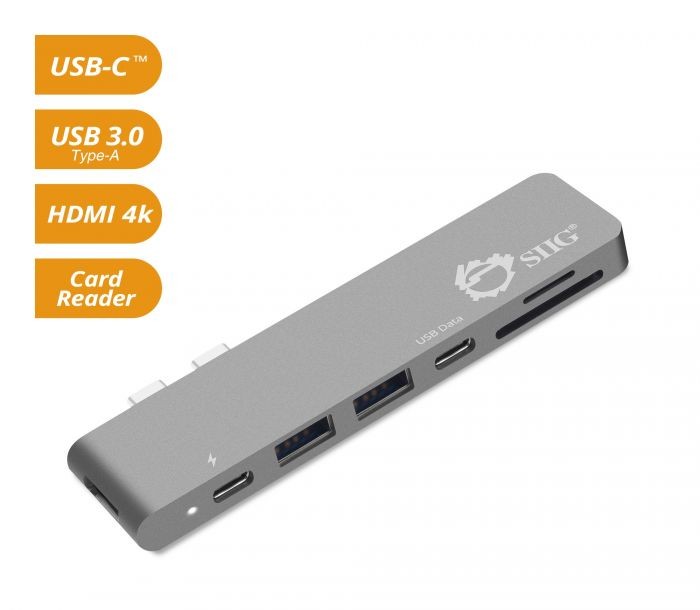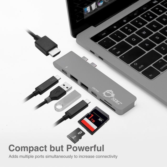 Adds a wide variety of ports to your MacBook Pro (13"/15") instantly. Includes - one USB-C Data/Power Delivery/Video port, one USB-C and two Type-A USB 3.1 Gen 1 ports, one 4K@30Hz HDMI port, one SD slot, one Micro SD slot