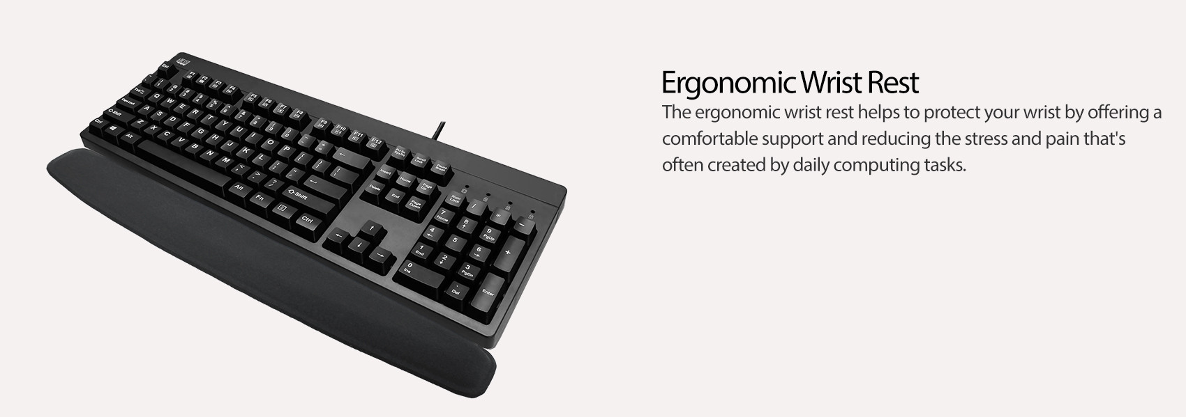 The ergonomic wrist rest helps to protect your wrists by offering a comfortable support and reducing the stress and pain that’s often created by daily computing tasks.