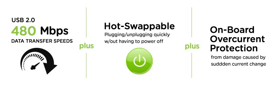 The Sharing Switch is USB 2.0 compliant, supporting a fast data transfer rate of up to 480 Mbps and each of its ports feature hot-swappable capabilities. On-board overcurrent protection also safeguards your connected devices from damage by a sudden current change in the environment.
