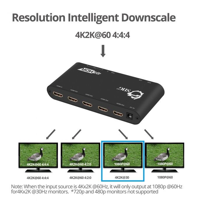 Auto video scaling feature detects and configures the video resolution automatically according to the capabilities of each connected monitor. Allows simultaneous 4K and 1080P output. Supports simultaneous mixed 4K and 1080p display outputs. *See Notes below for limitations