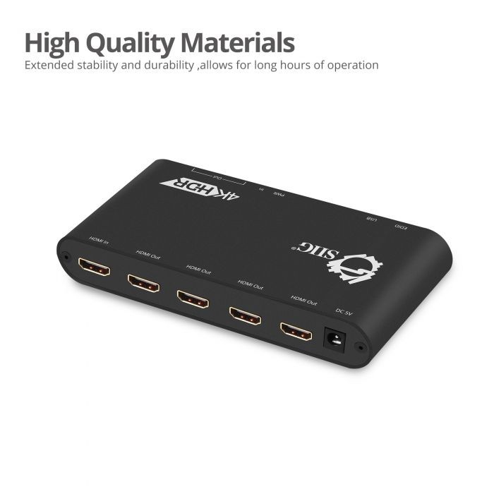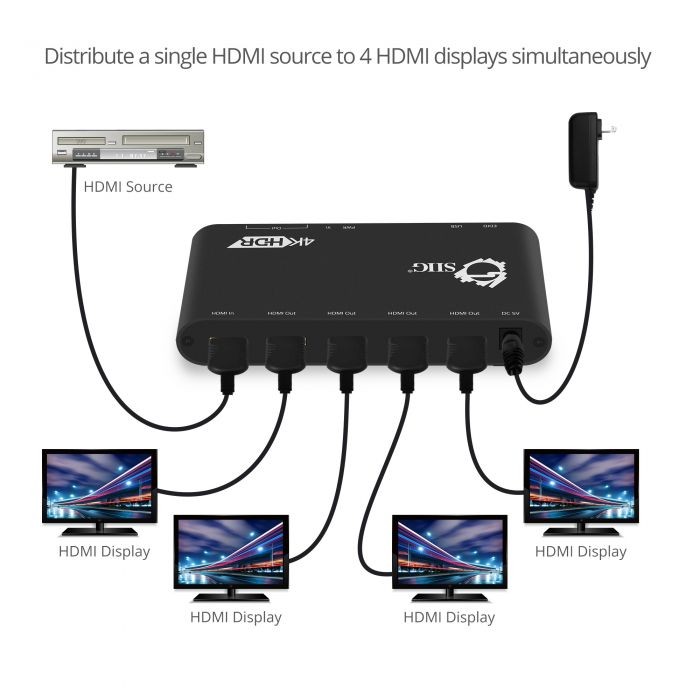 Distributes HDMI video and audio from a single source to up to 4 HDMI displays simultaneously while maintaining signal quality