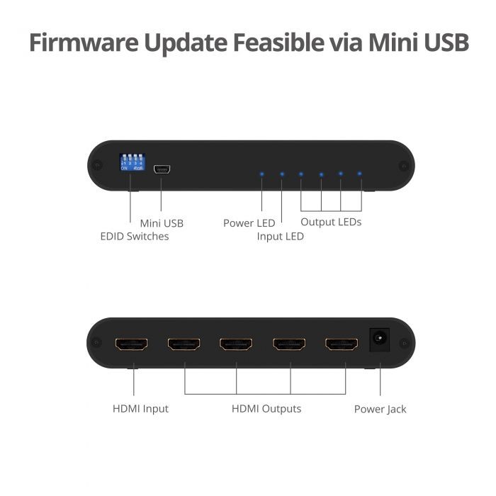 EDID and firmware management feature for maximum compatibility now and into the future, offers widest range of monitor/display/TV support from either pre-programmed EDID or EDID learning from the connected displays. Firmware upgradeable (via Mini USB port) for expanded compatibility