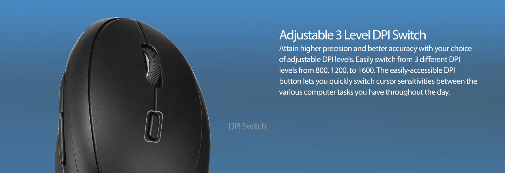 Attain higher precision and better accuracy with your choice of adjustable DPI levels. Easily switch from 3 different DPI levels from 800, 1200, to 1600. The easily-accessible DPI button lets you quickly switch cursor sensitivities between the various computer tasks you have throughout the day.