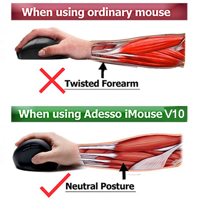 The wrist-friendly contour of the Adesso vertical mice allows you to hold your hand in a neutral “handshake position”, minimizing your forearm muscles from twisting and the possible development of Carpal Tunnel Syndrome. Normally, your forearm muscles are twisted from sitting flat on the supporting surface when using a regular mouse. This “flat position” causes strains on your muscles and leads to wrist pains. This is where the Adesso Vertical Mice become helpful and provide alleviation.