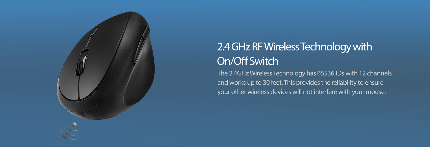 The 2.4GHz Wireless Technology has 65536 IDs with 12 channels and works up to 30 feet. This provides the reliability to ensure your other wireless devices will not interfere with your mouse.