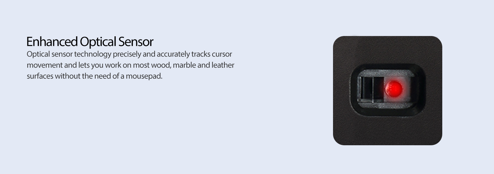Enhanced Optical Sensor Optical sensor technology precisely and accurately tracks cursor movement and lets you work on most wood, marble and leather surfaces without the need of a mousepad.