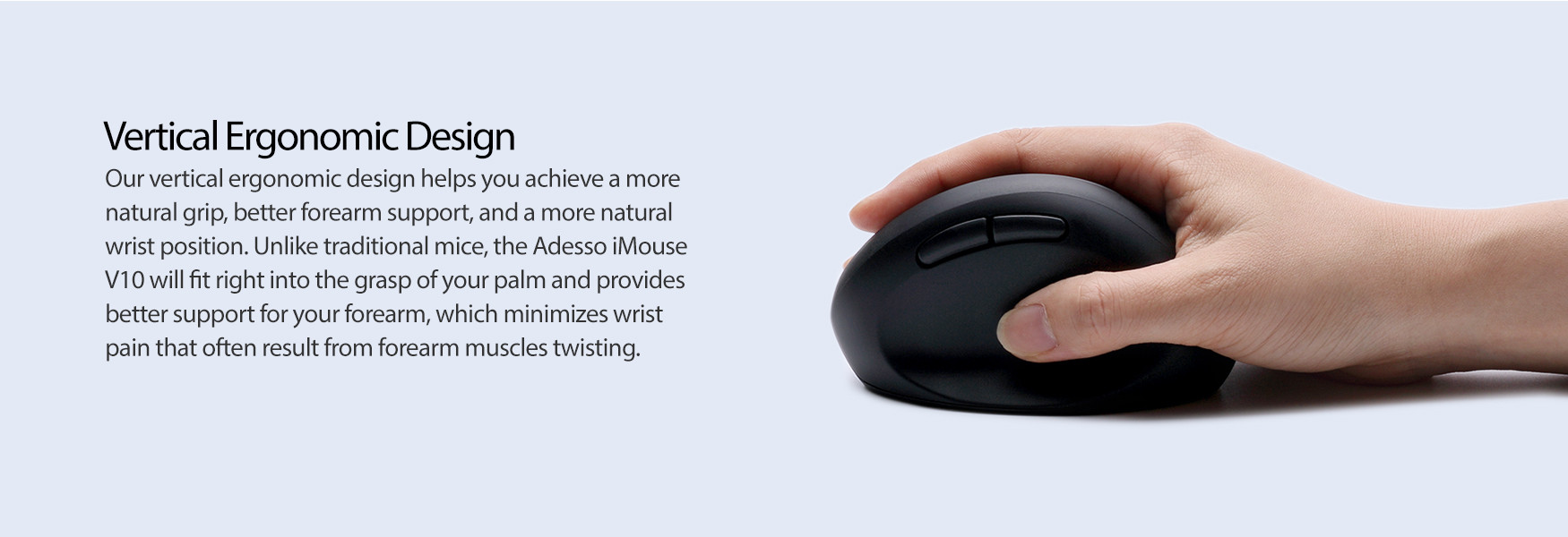 Our vertical ergonomic design helps you achieve a more natural grip, better forearm support, and a more natural wrist position. Unlike traditional mice, the Adesso iMouse™ V10 will fit right into the grasp of your palm and provides better support for your forearm, which minimizes wrist pain that often result from forearm muscles twisting.