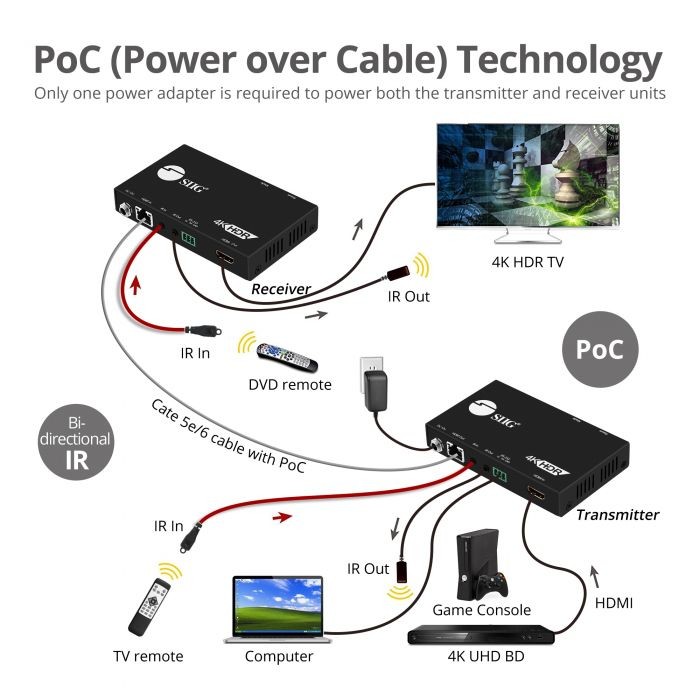 Bi-directional IR sensors allow you to remotely control the HDMI source device from the remote display side or control the remote display from the source device side