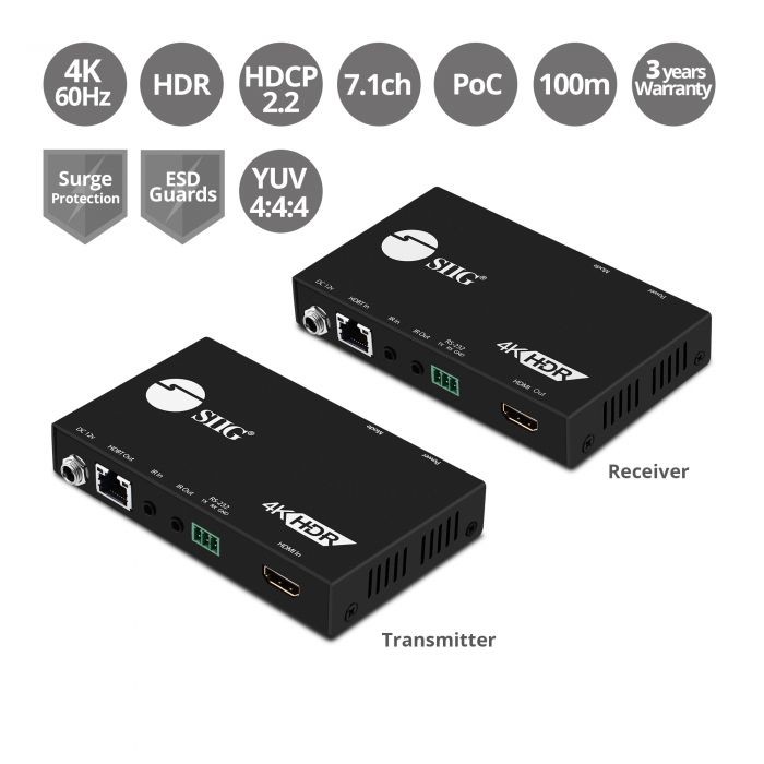 Extends HDMI 2.0 audio and video signal from your HDMI source to a remote HDMI display up to 330ft (100m) away at Full HD 1080p, or 230ft (70m) at 3840x2160@60Hz (YUV 4:4:4 8bit/HDR10 YUV 4:2:0 10bit) through a single premium quality CAT5e/6 cable