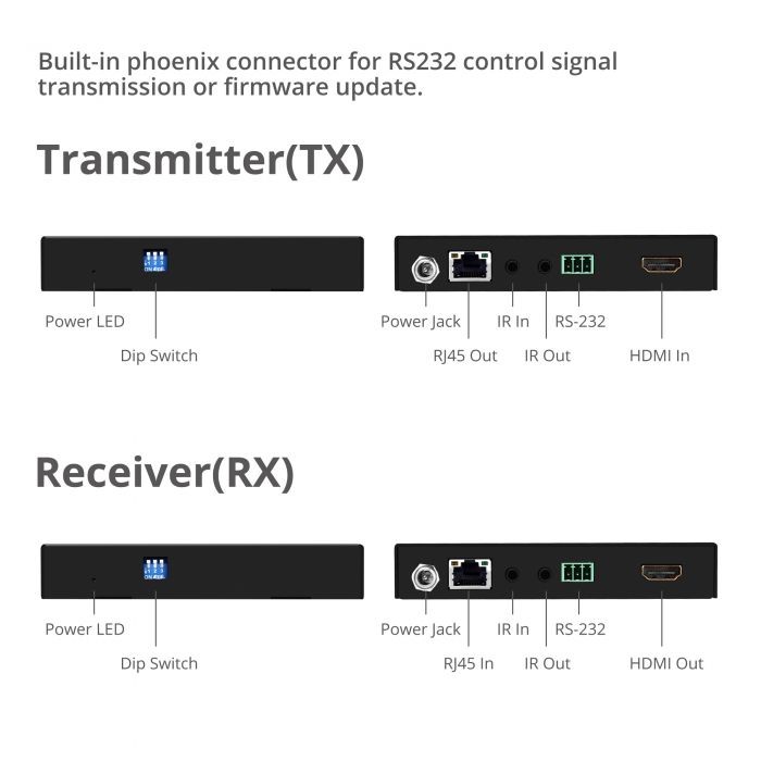 Extends HDMI audio and video signals, RS232 control, IR control up to 100 meters over a single CAT5e/6 cable with industry recognized HDBaseT technology