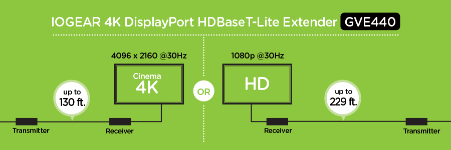 The Cinema 4K DisplayPort HDBaseT-Lite Extender offers professional-grade features, reliability, and video signal interference protection. Extend the range of a DisplayPort display up to 229 feet using a Cat 5e/6/6a cable. Achieve Cinema 4K resolutions of 4096 x 2160 @ 30Hz up to 130 feet from the source and 1080p @ 60Hz HD resolutions up to 229 feet away through a single extender.