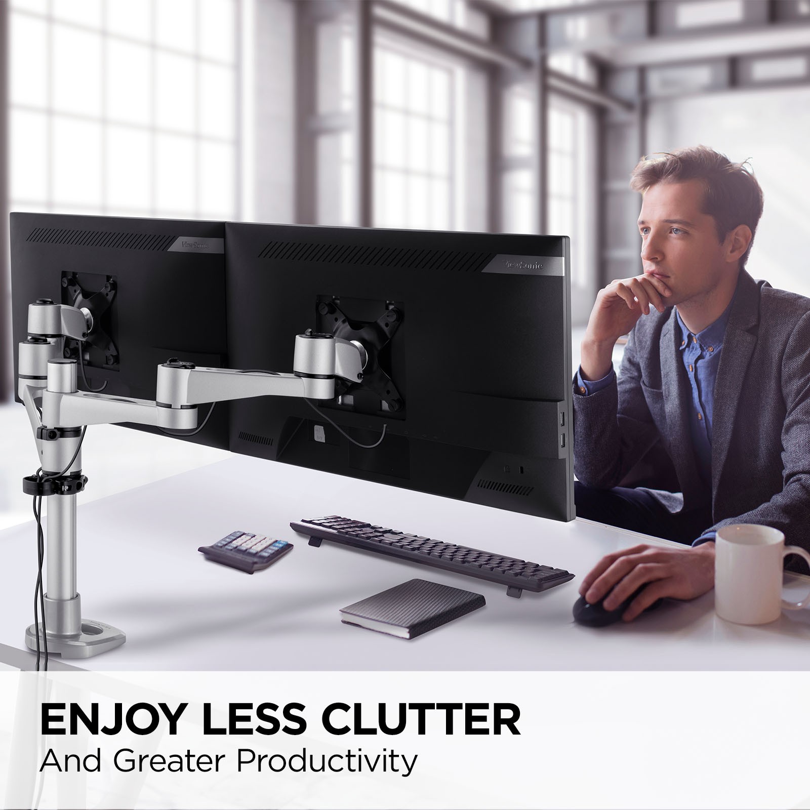 Need more real estate on your desktop? With the ViewSonic LCD-DMA-001 Dual Monitor Mounting Arm, you can position your monitors where you want them, even if your workspace is limited by a small desk or cubicle wall. With standard VESA-compatible mounting points, the LCD-DMA-001 can accommodate two monitors up to 24" in size, lifting them up and off your desktop to free up workspace and boost productivity. Full ergonomic adjustability lets you tilt, pan, swivel, pivot, and lift your monitors for customized comfort. What's more, an integrated cable management design minimizes cable clutter without interfering with ergonomic functionality, while a two-in-one desk mount design makes mounting to your workstation a breeze.