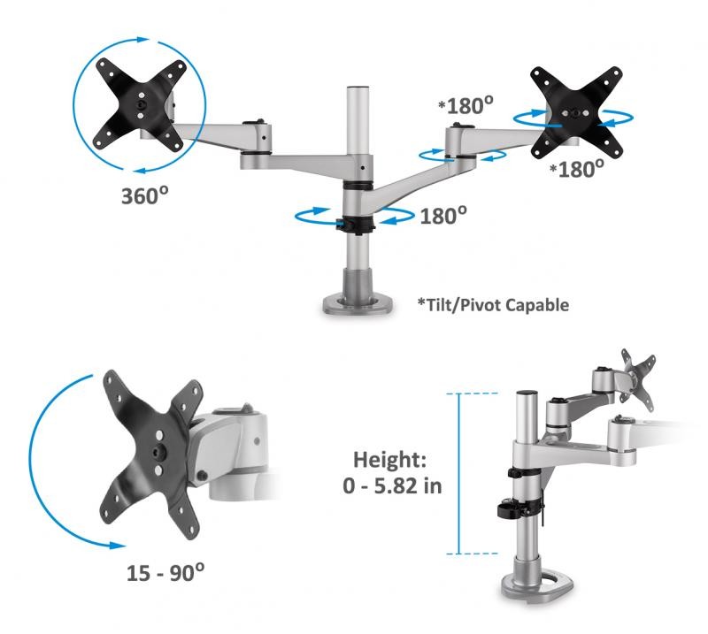 Full adjustability provides flexible setup for both of your monitors including landscape and landscape, portrait and portrait, or portrait and landscape orientations.