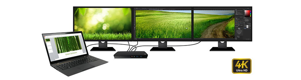 Enjoy the remarkable visual experience of 4K Ultra HD (UHD), at four times the resolution of standard HD. The Dock supports impressive, Cinema 4K quality on a single DisplayPort monitor to 4096 x 2160 @60Hz for enhanced enjoyment while watching videos, playing games, working and creating. Attach dual 4K UHD DisplayPort screens and add a third 4K UHD HDMI display for crystal clear images and video quality to 3840 x 2160 @60Hz across all three.