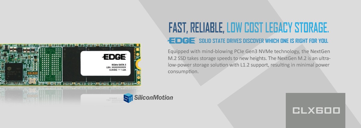The EDGE CLX600 line of SSD products caters to system integrators in need or quality storage at an affordable price. The CLX600 M.2 SSD features a Silicon Motion controller and 3D NAND to promote a high-performing and reliable computing environment.