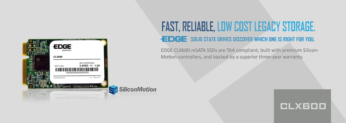 The EDGE CLX600 line of SSD products caters to system integrators in need or quality storage at an affordable price. The CLX600 mSATA SSD features a Silicon Motion controller and 3D NAND to promote a high-performing and reliable computing environment.
