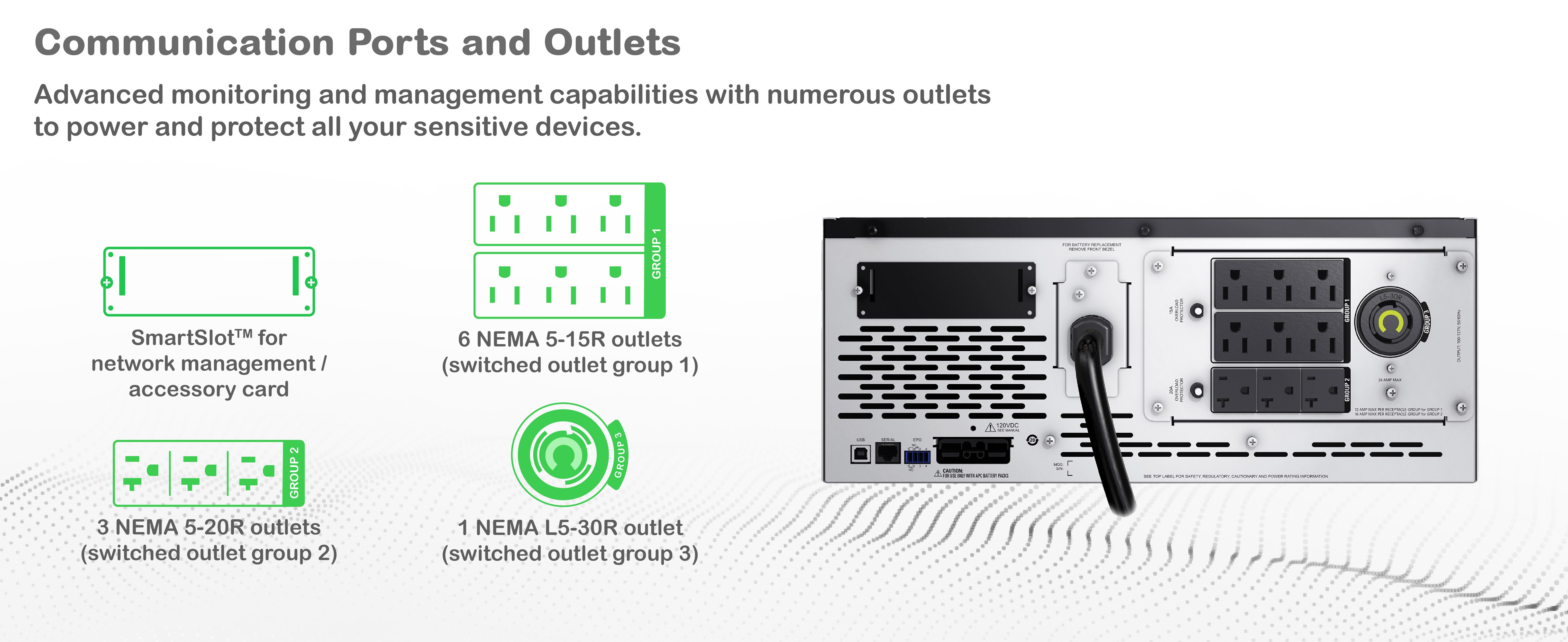 Switched outlet groups provide greater control, allowing you to reboot hung devices, program sequenced on and off, and perform non-critical load-shedding of equipment.