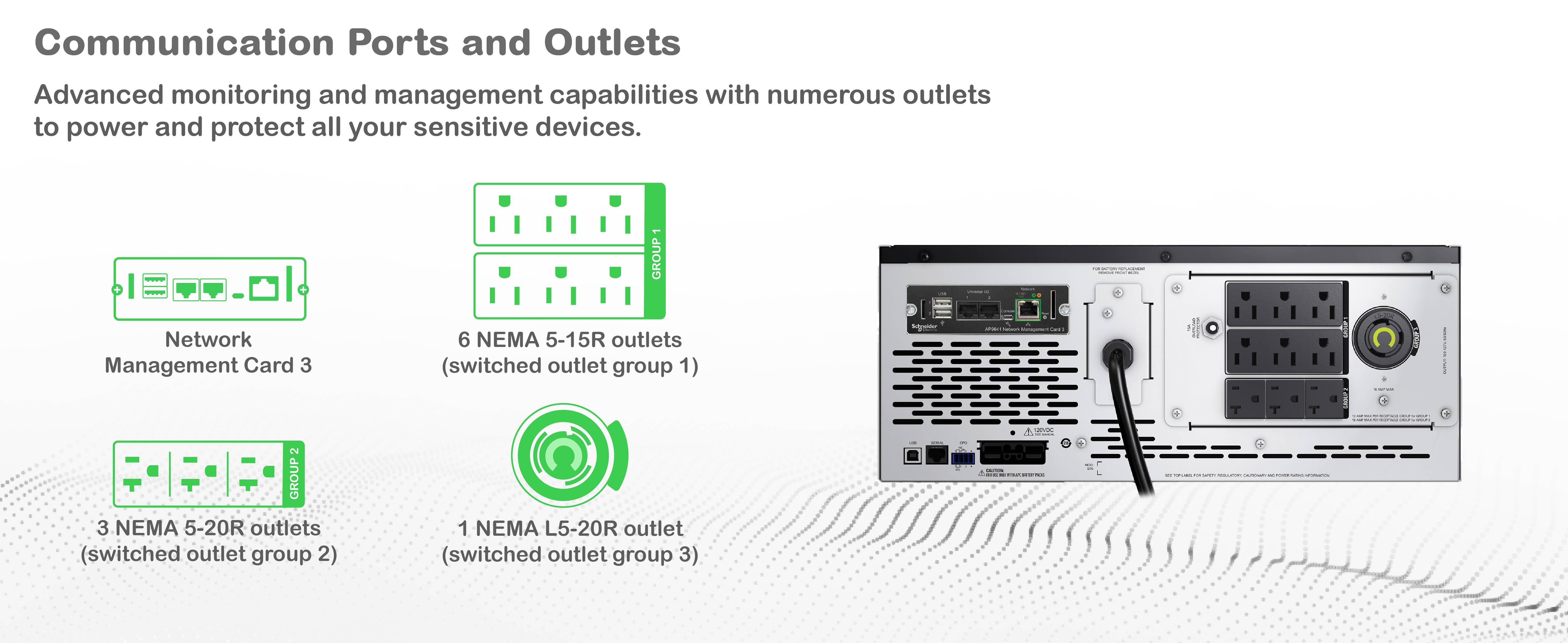 Switched outlet groups provide greater control, allowing you to reboot hung devices, program sequenced on-and-off and non-critical load shedding of equipment.